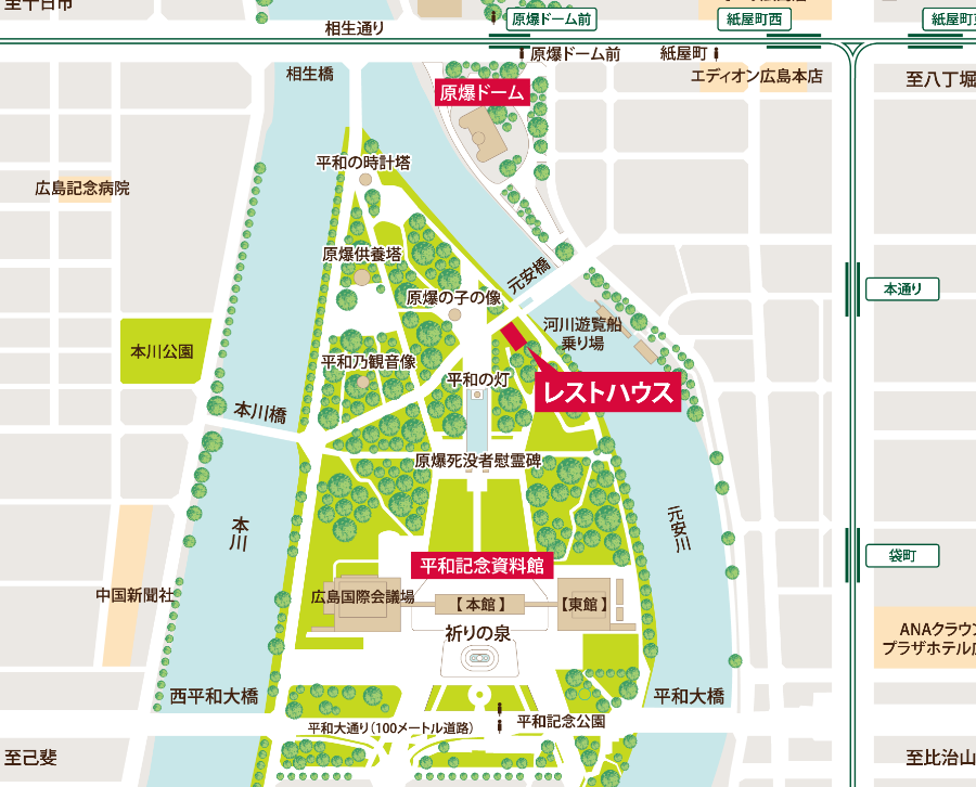 - バス:市内バスも利用可能です。広島バスターミナルから、平和公園行きのバスが定期的に運行しています。所要時間は約25分です。