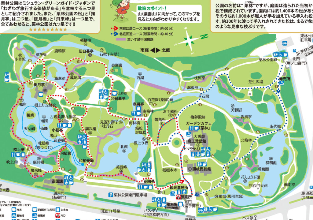 - バス利用: 高松市内から栗林公園行きのバスが頻繁に運行されています。特に香川県内では交通の便が良いです。