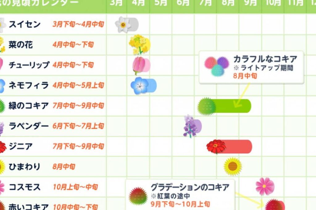 春には約450万本のネモフィラが一面に広がり、その美しさに心奪われます。また、この時期はチューリップや桜も見頃を迎え、多彩な花々が楽しめます。他にも、秋にはコキアや紅葉に染まった景色が広がります。特に10月中旬から11月上旬には真っ赤なコキアで公園全体が彩られ、訪れる価値があります。