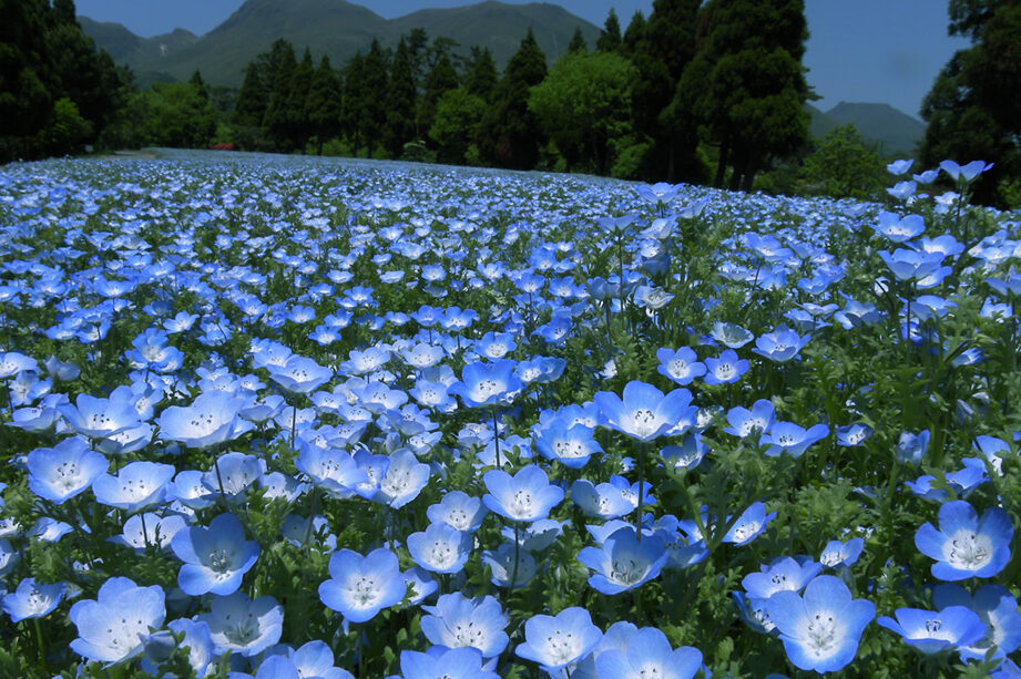 くじゅう花公園は、四季折々の美しい花が楽しめる人気の観光地です。特に春には、青いネモフィラが一面を覆い、訪れる人々を魅了します。