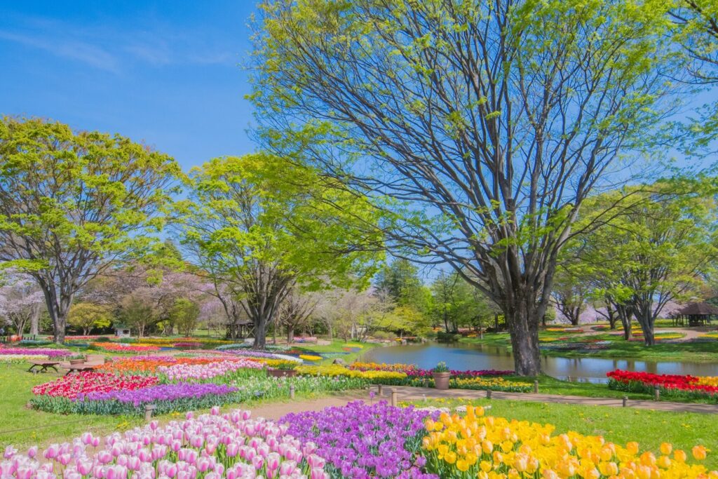 昭和記念公園は、東京都立川市に位置する広大な公園です。ここには、四季折々の花々が美しく咲き誇り、特に春には色とりどりのチューリップを楽しめます。公園内には約180種類、約1,200,000本のチューリップが植えられており、多くの訪問者がその美しさに魅了されています。