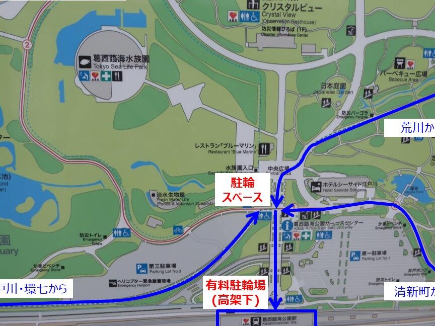 - 東京メトロ東西線: 葛西駅から徒歩約15分。公園へは平坦で歩きやすい道が続きます。