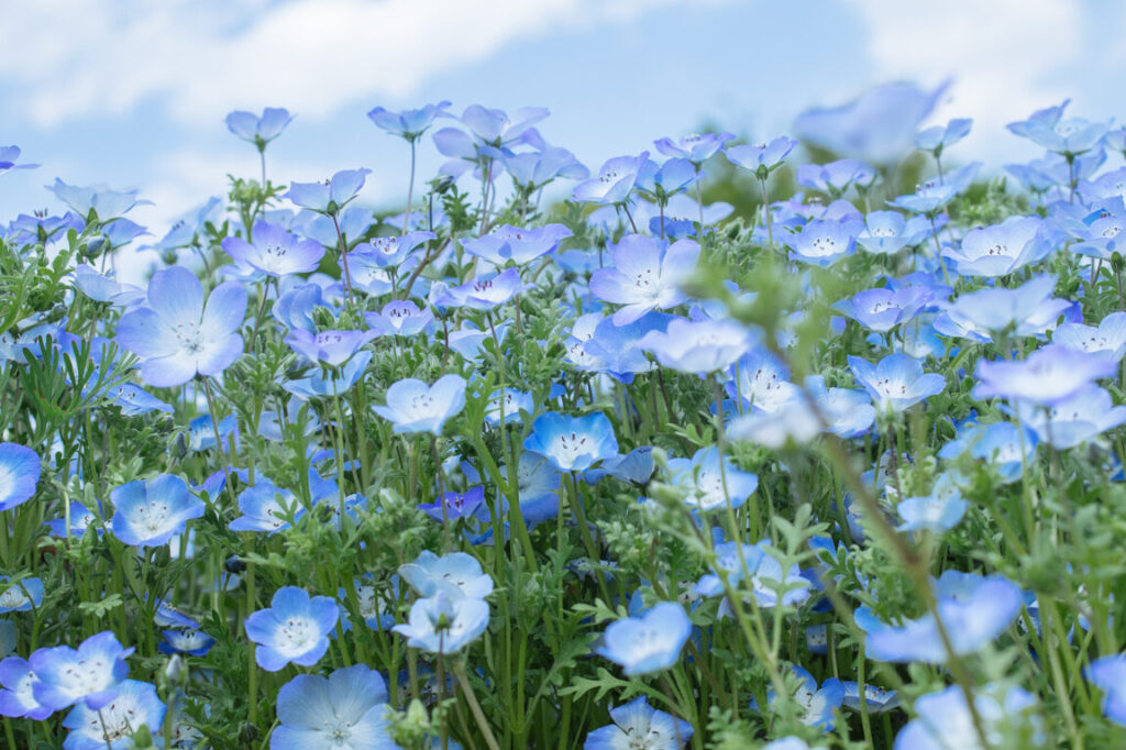 ネモフィラは、その美しい青色が特徴的な花です。特に昭和記念公園では、広大な敷地に一面のネモフィラが咲き誇り、多くの観光客を魅了します。